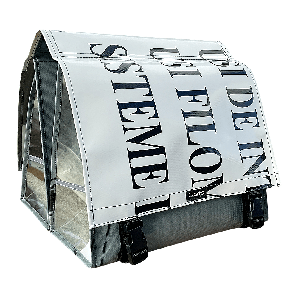 Die doppelte Fahrradtasche ReCYCLEd – Circus von Clarijs Fietstassen ist eine umweltfreundliche und stilvolle Fahrradtasche für den bewussten Radfahrer.