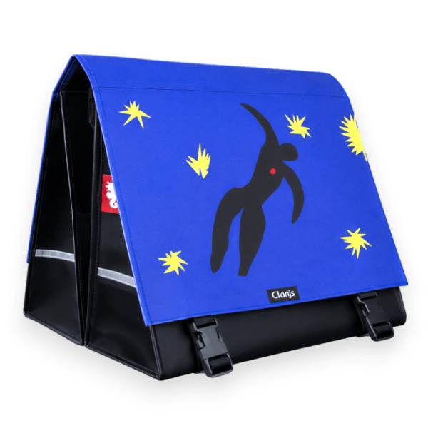 De Dubbele Fietstas Icarus van Clarijs uit de speciale ART Edition is dé dubbele fietstas met print voor liefhebbers van de kunstschilder Henri Matisse. Deze handgemaakte dubbele fietstas uit Nederland is gemaakt van sterk en spatwaterdicht Bisonyl PVC-doek en voorzien van reflectie aan zowel de voor- als achterkant voor extra zichtbaarheid in het verkeer.