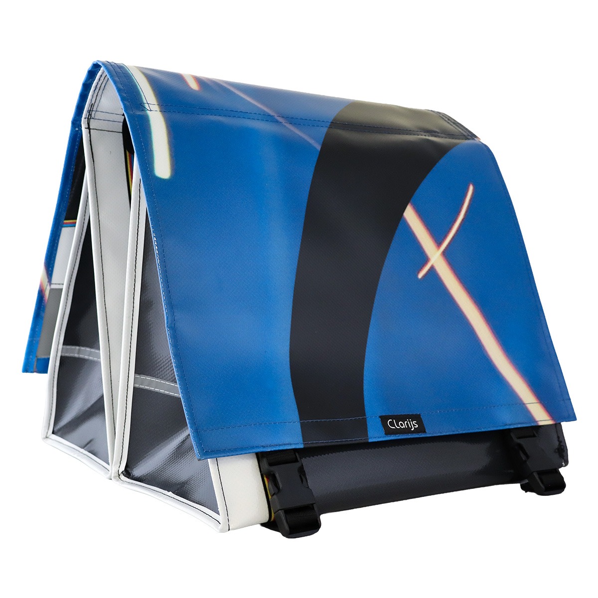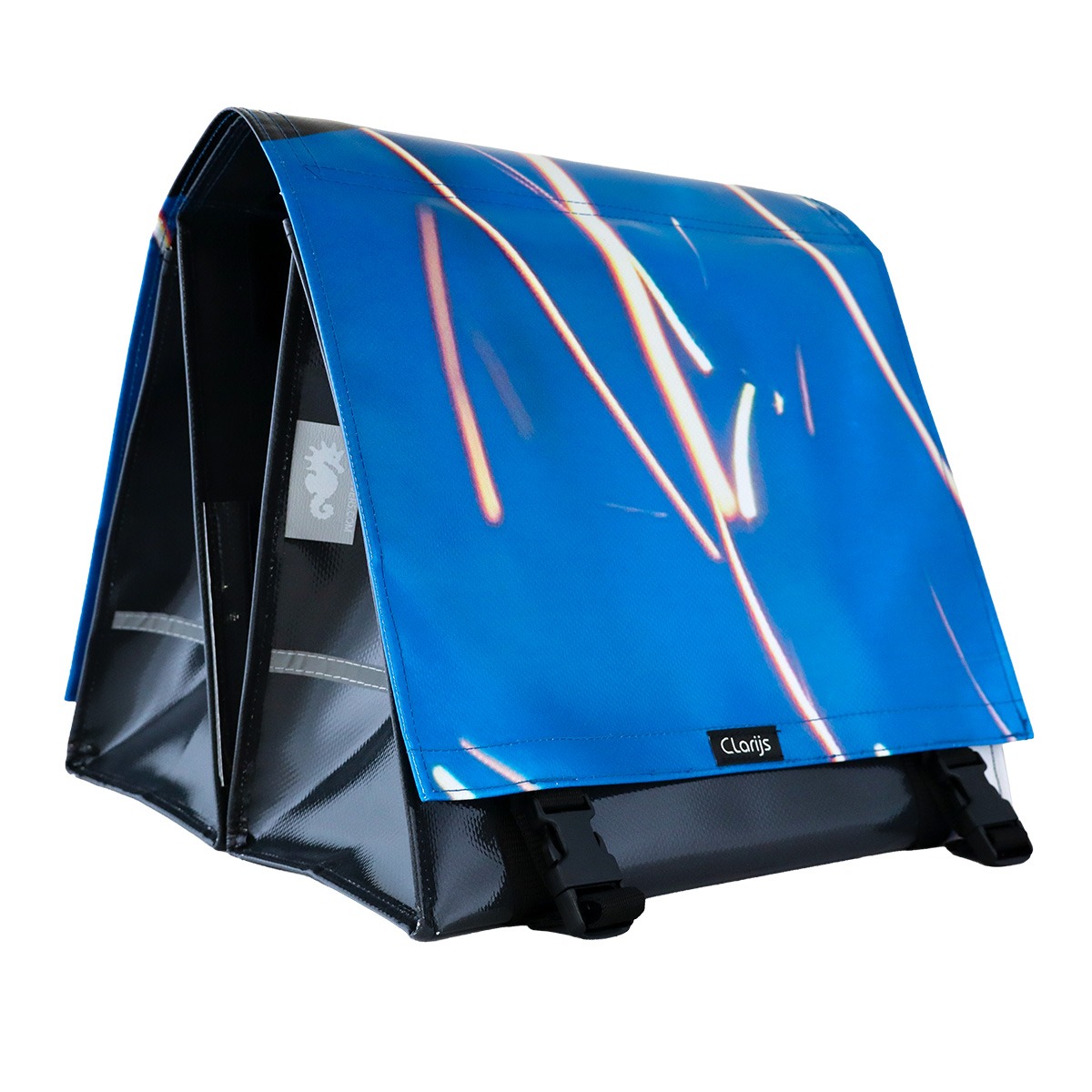 De Dubbele Fietstas reCYCLEd – Spark 1 van Clarijs Fietstassen is een milieuvriendelijke en stoere fietstas voor de bewuste fietser. Deze fietstassen worden met de hand gemaakt van reCYCLEd vrachtwagen doek, dit maakt elke fietstas uniek.