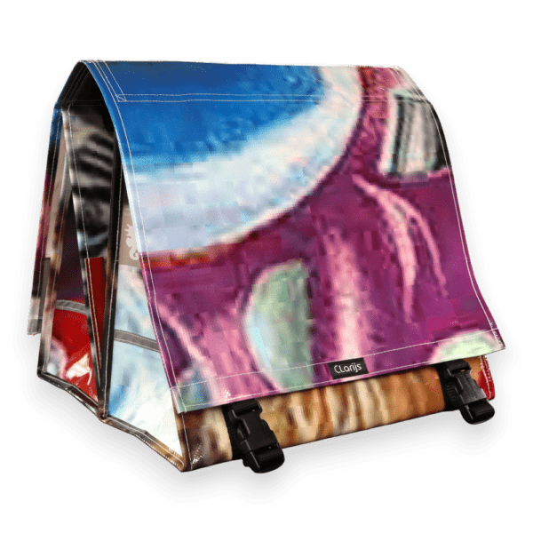 Please note that because the panniers are cut from large pieces of truck fabric, no two bags are exactly the same as the product photo. Colours and patterns may vary, giving you a truly unique, one-of-a-kind bag with its own character.