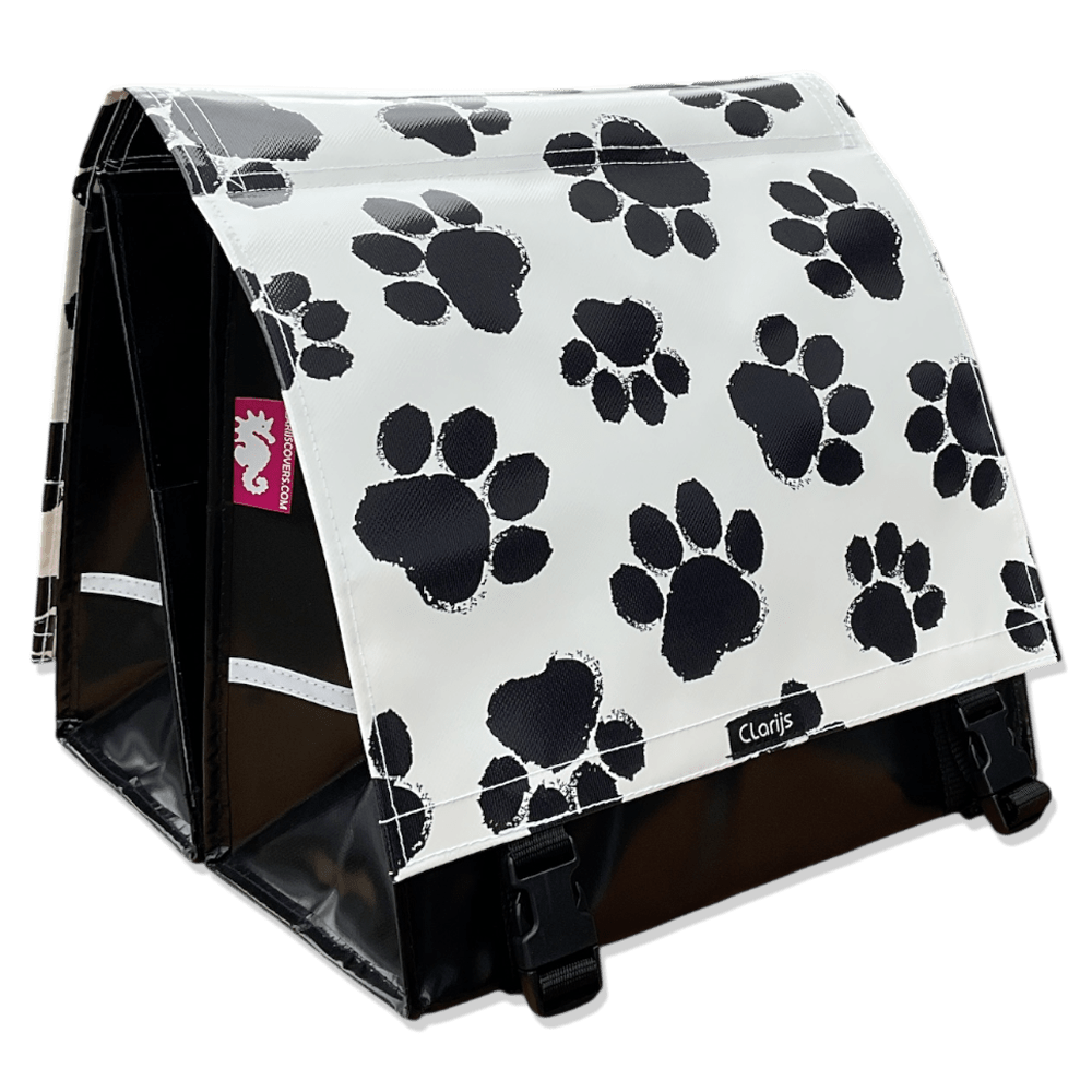 The Double Bike bag Buddy tracks by Clarijs is a true eye-catcher. The black-and-white design with playful dog paw prints makes your bike instantly personal and stylish. Handmade in the Netherlands from strong, waterproof Bisonyl PVC fabric, keeping your belongings safe and dry. Perfect for both daily rides and longer cycling trips.
