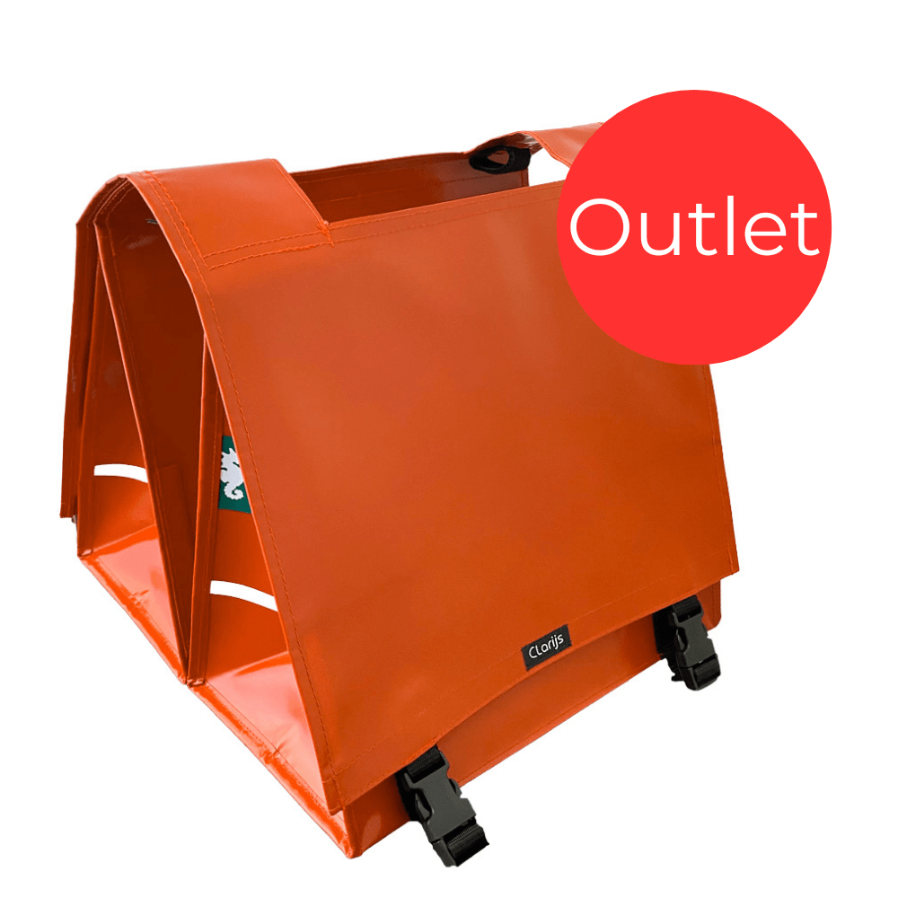 The Outlet – Double Bike Bag Orange with Cut-out is a handmade and fully functional bike bag from Clarijs. This item has small imperfections, such as light scratches, and is therefore part of our outlet. With a 35% discount you enjoy the same quality and durability, but now at an extra sharp price.