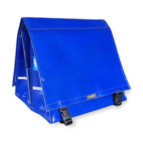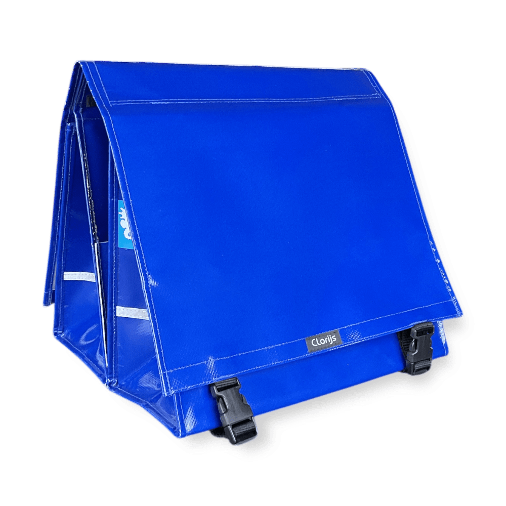The Double Bike Bag reCYCLEd – Blue by Clarijs Fietstassen is an eco-friendly and unique bicycle bag for the conscious cyclist. This bag offers a durable and practical solution for carrying your belongings during your cycling adventures. These panniers are handmade from reCYCLEd truck canvas, making each bag truly unique.